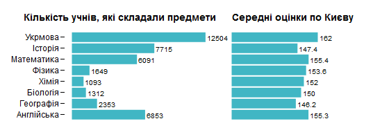 Спочатку загальні цифри. Нижче в інфографіці дані кількості учнів, які складали іспити, а також середні бали всіх шкіл міста з кожного предмету (де 100 - мінімальний результат, а 200 балів - максимальний).