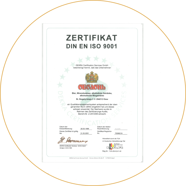 "Оболонь" підтверджує високу організацію системи управління якістю і вперше в Україні отримує сертифікат згідно стандарту ISO-9001 версії 2000 року.