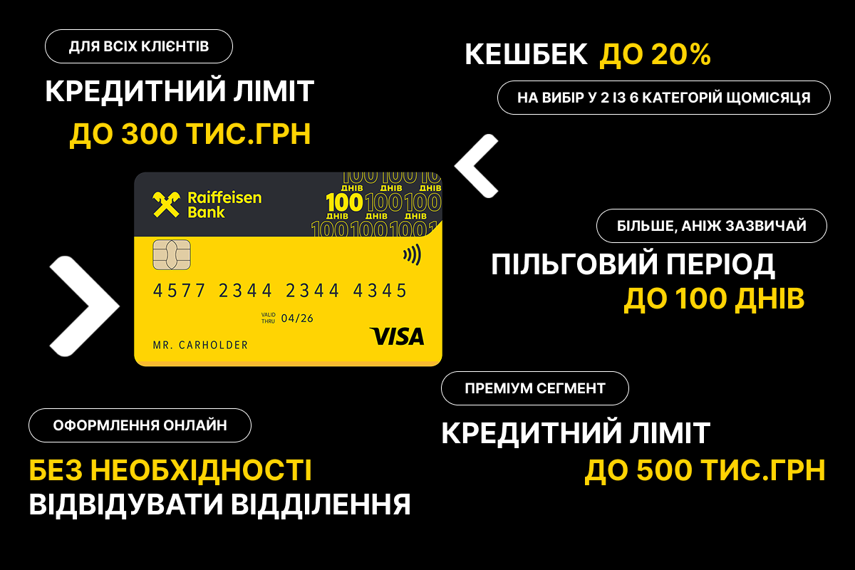 Оформити онлайн можна також і кредитну картку. У 2025 році Райффайзен Банк запустив оновлену кредитну картку для масового сегмента, яку можна оформити без відвідування відділення.