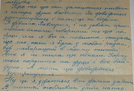 Я чогось була впевнена, що Павло повернеться. Я йому так і написала, а він хвацько так відповів: "Коли б твої слова здійснилися, то поцілувать тебе треба за це, і навіть більше".