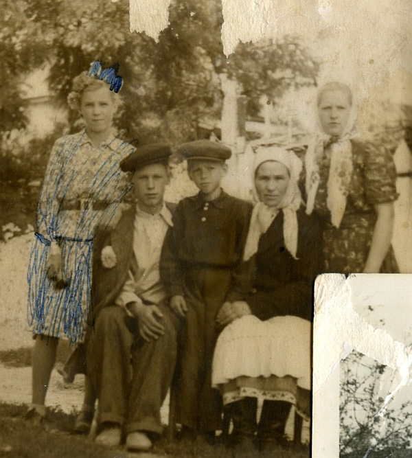 | На фотографії моя бабуся Пелагея із вижившими дітьми, приблизно у 1949 році. Моя мама крайня зліва (розмальована синьою ручкою - художества старшої сестри) |