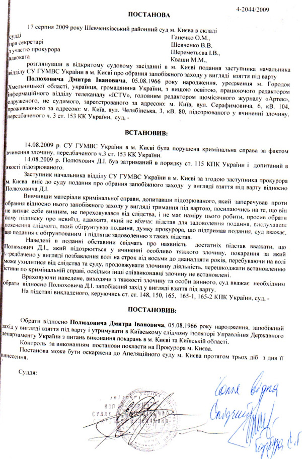 Еще две недели назад, пересылая свое решение по одному из аспектов дела, следователь Гарбуза подкрепил свой ответ выпиской из решения суда от 17 августа 2009 года, в котором написано: "Наведені в поданні обставини свідчать про наявність достатніх підстав вважати, що Полюхович Дмитро, який підозрюється у вчиненні особливо тяжкого злочину, покарання за який передбачено у вигляді позбавлення волі на строк від восьми до дванадцяти років, перебуваючи на волі - може ухилитися від слідства та суду, продовжуючи злочинну діяльність, перешкоджати встановленню істини по кримінальній справі, оскільки інші співвиконавці злочину не встановлені.