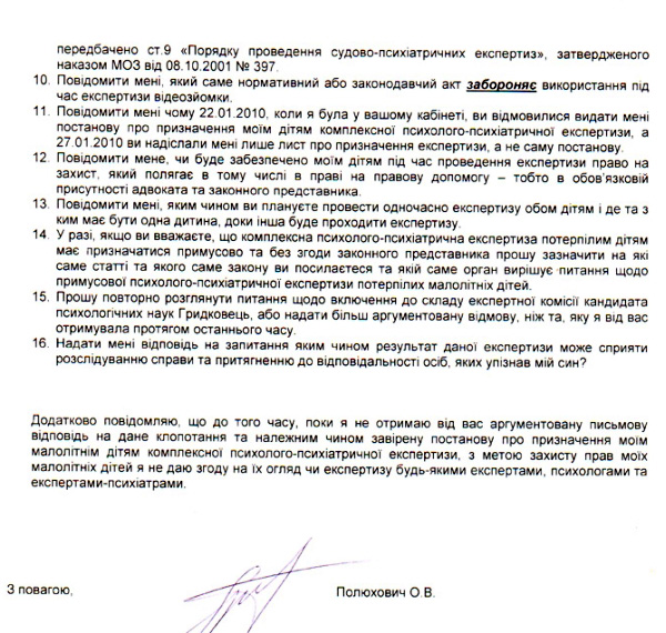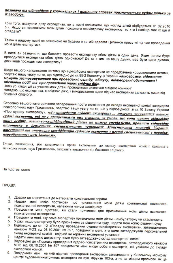 Она выставила только два условия: экспертиза должна сниматься на видео, и во время экспертизы будет присутствовать психолог, которая была привлечена к работе с детьми тогдашним следователем еще в июле 2009 года, и которая давала экспертное заключение о состоянии детей.