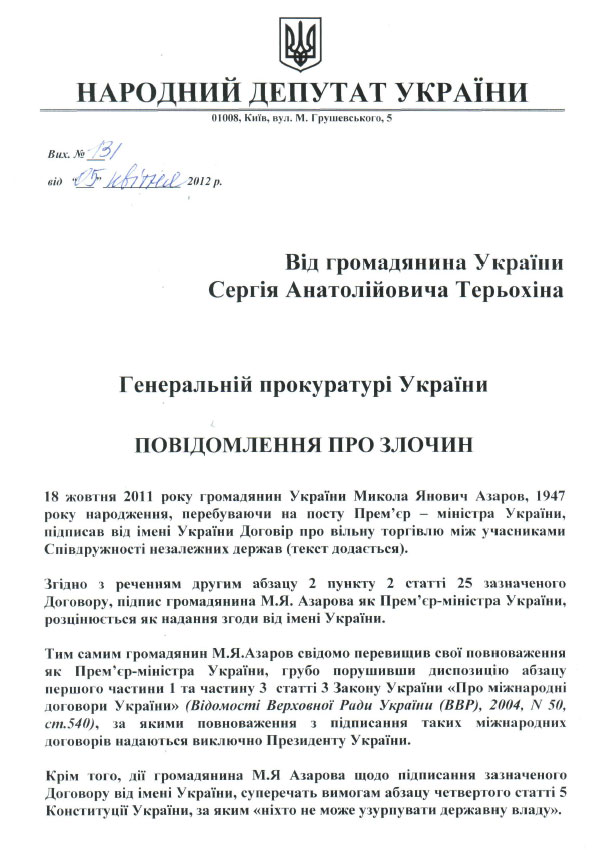 Так от, я тільки-но звернувся до Генпрокурора з проханням юридично оцінити дії Азарова (копія мого листа додається).