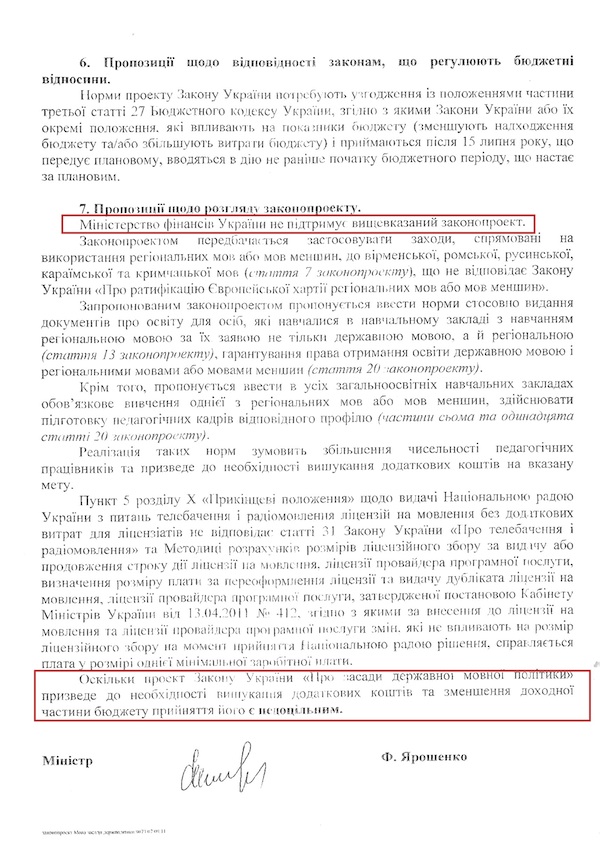 У висновках стосовно проекту сказано, що "проект закону про мови від 2011 року не в змозі забезпечити належний баланс між розвитком і використанням державної мови як об'єднуючого чинника в житті суспільства та розвитком і захистом мов меншин".