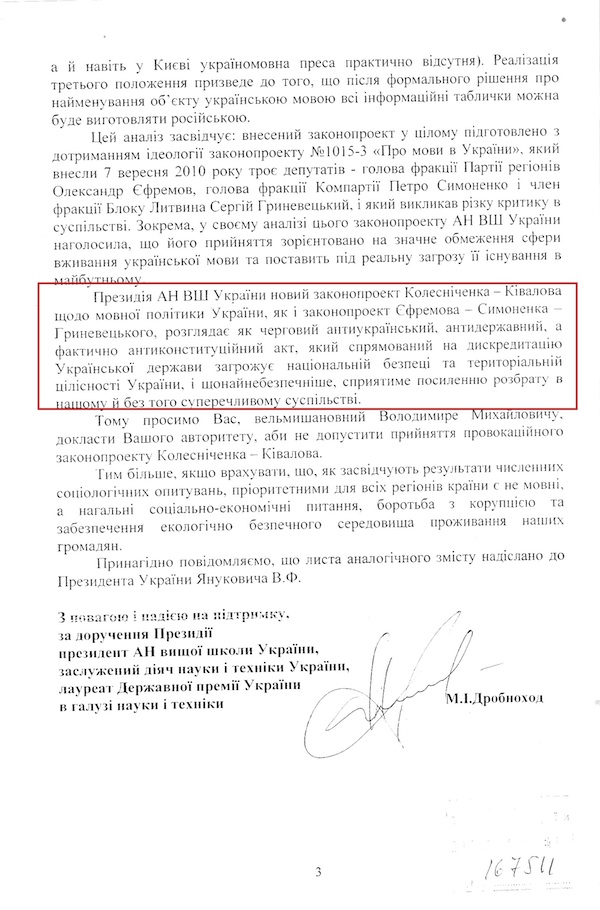 Проти закону про мови виступила й президія Академії наук Вищої школи. У своєму висновку вони розглядають даний законопроект Колесніченка-Ківалова "як черговий антиукраїнський, антидержавний, а фактично антиконституційний акт, який спрямований на дискредитацію Української держави, загрожує національній безпеці та територіальній цілісності України".