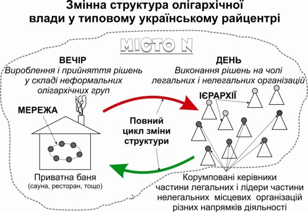 У містах з більшою кількістю жителів та обласних центрах йде перманентна боротьба між різними "тісно згуртованими групами" з корумпованих керівників різнотипних організацій за контроль над ресурсами відповідної території та важелями влади, яка набуває жорстких, а, часом, жорстоких форм.