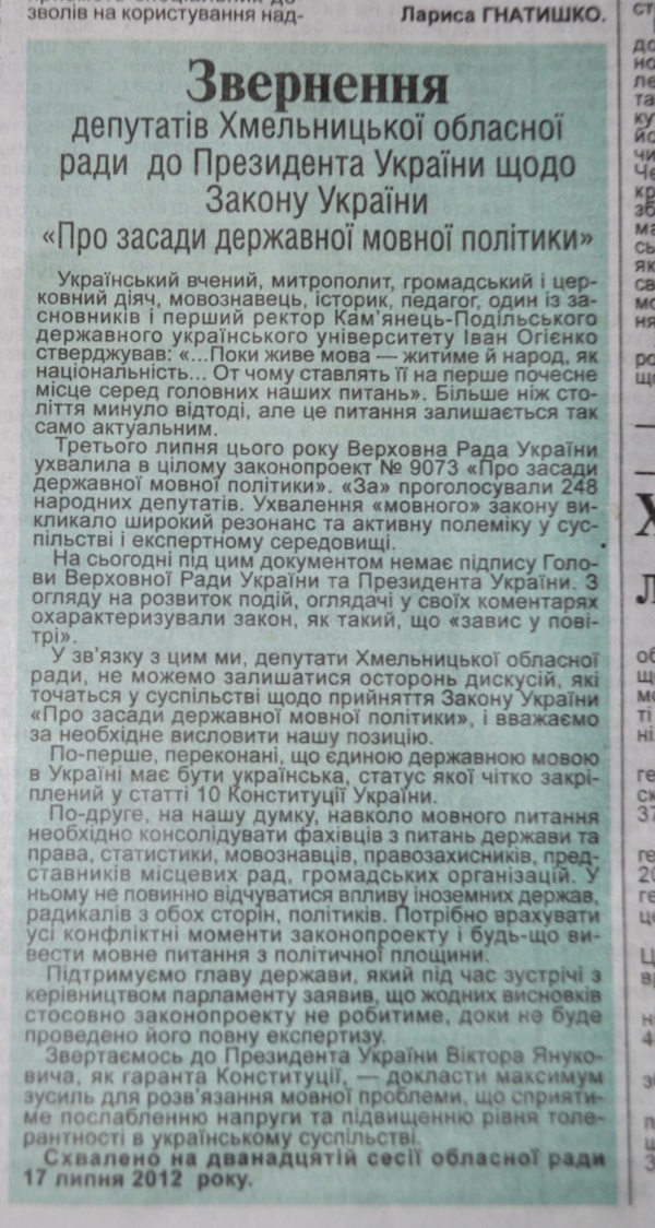 По-друге, сам Ксенжук нахабно збрехав, сказавши на офіційному сайті ФЗ про те, що "за наполяганням представників об'єднаної опозиції, Хмельницька облрада прийняла звернення до президента з вимогою ветувати мовний законопроект".