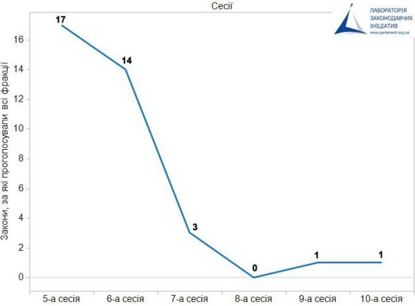 Але разом із тим, у парламенті фактично зникли закони, які б підтримувалися всіма фракціями та депутатською групою згодом. Якщо за п'яту сесію, вересень 2009/січень 2010 року, таких законів було 17, то за сьому, вересень 2010/січень 2011 року – усього 3, а за наступну не було зовсім.