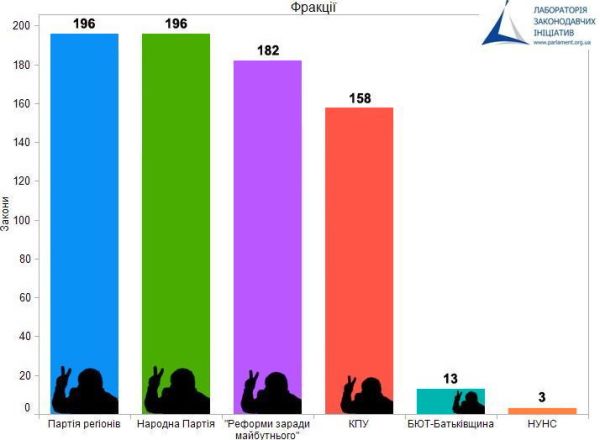 Колег-регіоналів беззастережно підтримували члени фракції Народної партії, які так само не пропустили жодного результативного голосування. Трохи менше голосів давала група "Реформи заради майбутнього". А комуністи, як "справжня опозиція у владі", не проголосували за 38 законів товаришів по більшості.