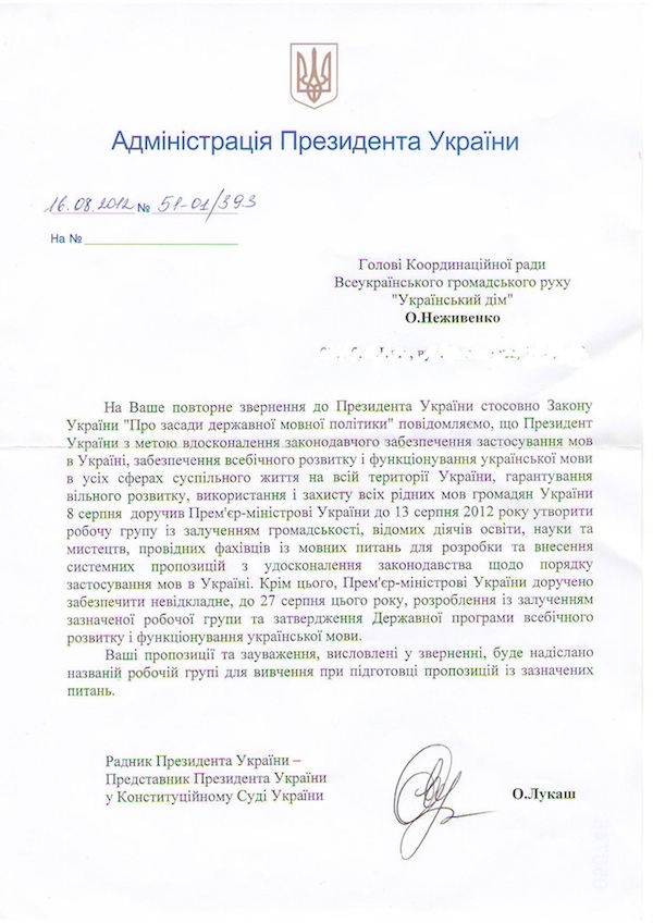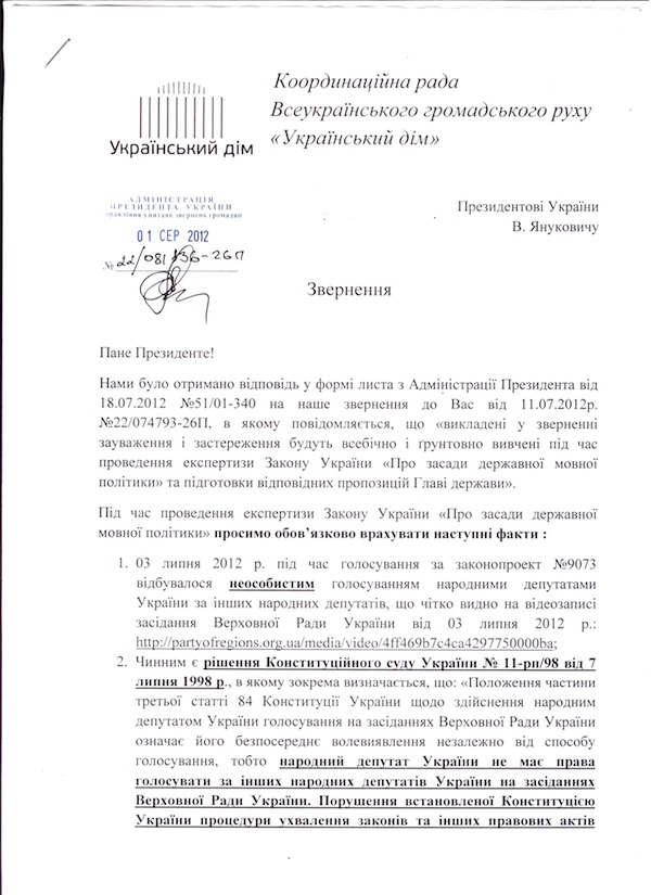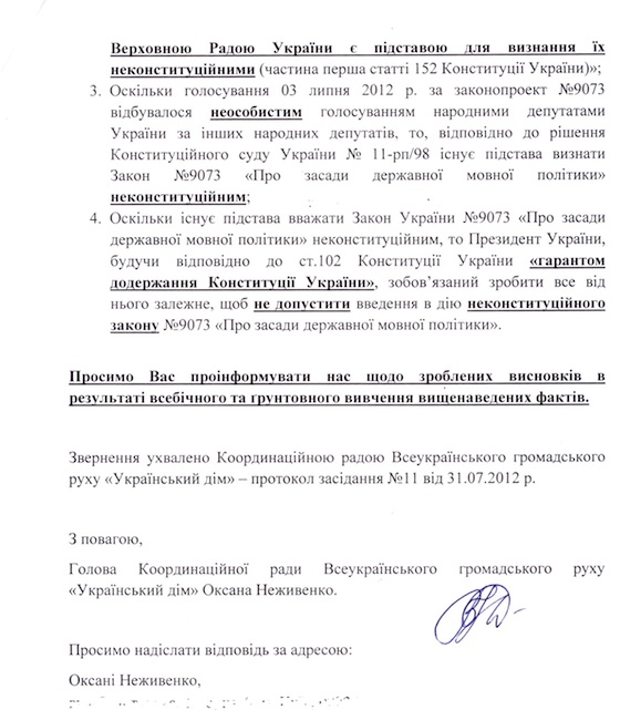 1 серпня, після підписання головою ВРУ Володимиром Литвином законопроекту 9073 "Про засади державної мовної політики", я звернулася від імені Всеукраїнського громадського руху "Український дім" до президента України як "гаранта додержання Конституції" з вимогою не допустити введення в дію цього неконституційного закону.