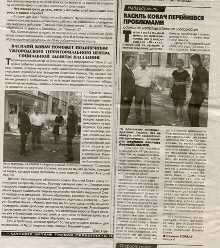 Переймається проблемами непрацездатних ужгородців Василь Ковач (округ №68) – той самий текст по-російськи і по-українськи в двох обласних газетах Закарпаття: "Фест" від 7-13 вересня, №35 та "Європа – центр" від 7 вересня, №36. Підписи під статтею різні: "Наш корр." та "Степан Горват".