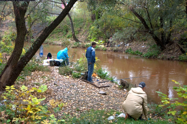| Річка Суха Московка у центрі Запоріжжі перетворена металургією на каналізаційну канаву. Для багатьох мешканців це улюблене місце медитацій та дозвілля. Рибу, виловлену у "червоній воді", запоріжці споживають самі й частують нею друзів |