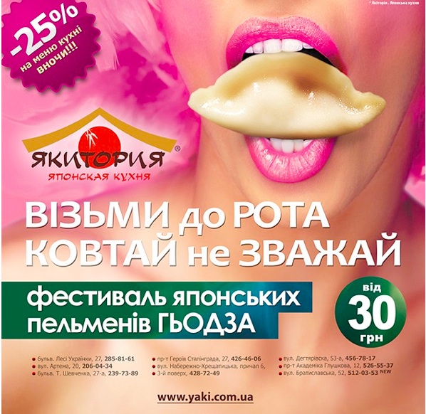 Справедливости ради, отметим, что в упомянутом перечне запрещенной рекламы есть следующее положение: "в рекламе запрещается … распространять рекламу…, содержащую элементы … порнографии, цинизма, унижения человеческой чести и достоинства". Однако "Подтянуть" сюда представленную выше рекламу японской кухни будет очень сложно.