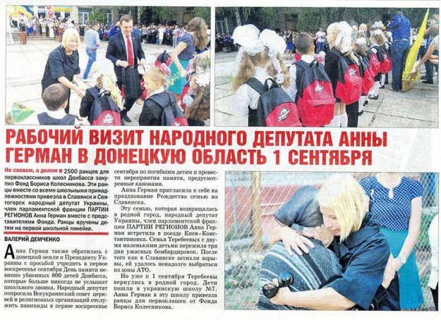 Ось тут фото, яка Ганна Герман роздає подаруночки школярам, а ось тут обнімає стару жінку з чорною хустиною, а ось тут школярі в закуплених Фондом Бориса Колеснікова однакових рюкзаках. Крім того, Герман запросила до себе на святкування Різдва сім’ю із Слов’янська — ну хіба вона не няшка?
