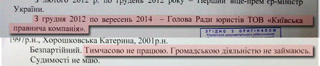 Після цього він 21 вересня 2014 подає до ЦВК "уточнену" автобіографію. У цьому документі Хорошковський "пригадує", що з грудня 2012 по 2014 рік він не був безробітним – а, виявляється, працював головою ради юристів у фірмі "Київська правнича компанія".