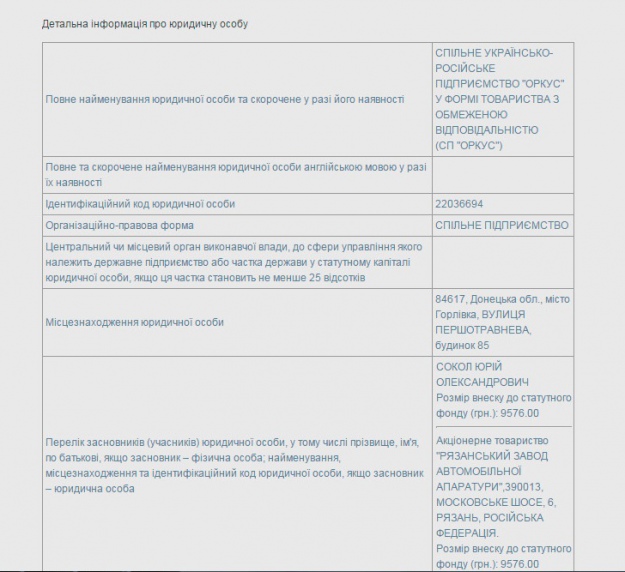 В том же реестре указывается, что совладельцами "Оркуса" в равных долях являются Сокол Юрий Александрович со взносом в уставный фонд в размере 9.676 гривен – это сын Александра Сокола, и АО "Рязанский завод автомобильной аппаратуры" – взнос аналогичный, предприятие зарегистрировано по адресу: Рязань, Московское шоссе, 6.