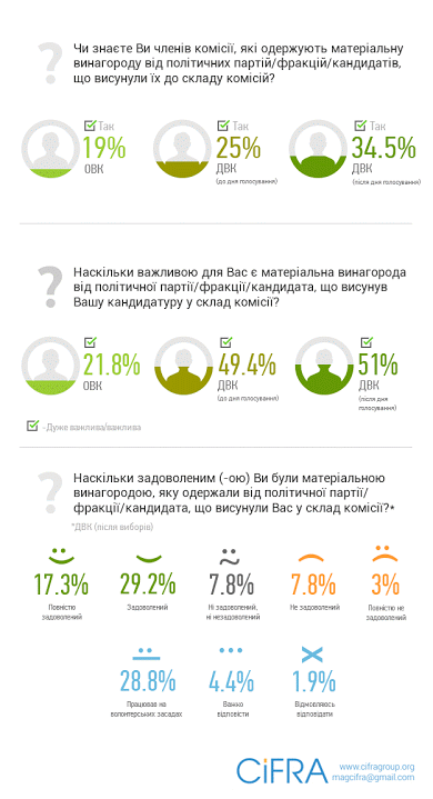 Відповідь на це питання дає соціологія. Моніторингово-аналітична група "ЦИФРА" і професор політології Ерік Херрон із Університету Західної Вірджинії за участі Київського Міжнародного Інституту Соціології протягом останніх парламентських виборів провели три соціологічних дослідження. Опитувались члени окружних і дільничних виборчих комісій. Нижче подаємо результати відповідей на питання, які стосувались оплати праці членів комісій суб’єктами виборчого процесу: