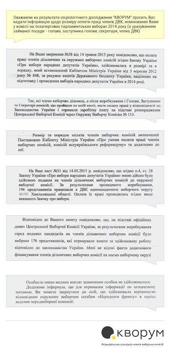 Одержані відповіді були систематизовані у дві групи. До першої з них потрапили ті, у яких чітко вказувалось, що члени виборчих комісій від кандидатів працювали на громадських засадах.