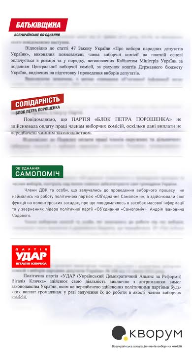 Більш важливими, однак, є відповіді від політичних партій, оскільки саме вони делегували найбільшу кількість членів виборчих комісій. З 470 000 членів ДВК на парламентських виборах 2014 року партії та їхні фракції у парламенті були представлені у комісіях 312 000 членів дільничних виборчкомів. Витяги із одержаних відповідей подаються нижче: