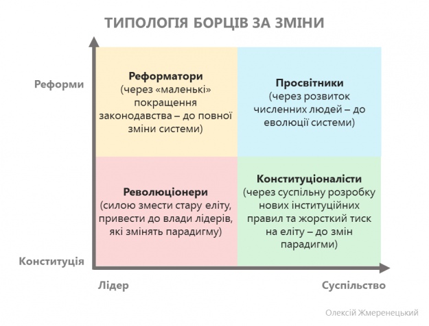 Проте революцію не здійсниш "за реформу в ЖКГ" чи "за покращення освіти". Революція потребує мобілізації широких мас, висуває на прапор парадигмальні, актуальні для загалу ідеї та лідерів – носіїв цих революційних ідей, які обіцяють запровадити радикальні зміни.