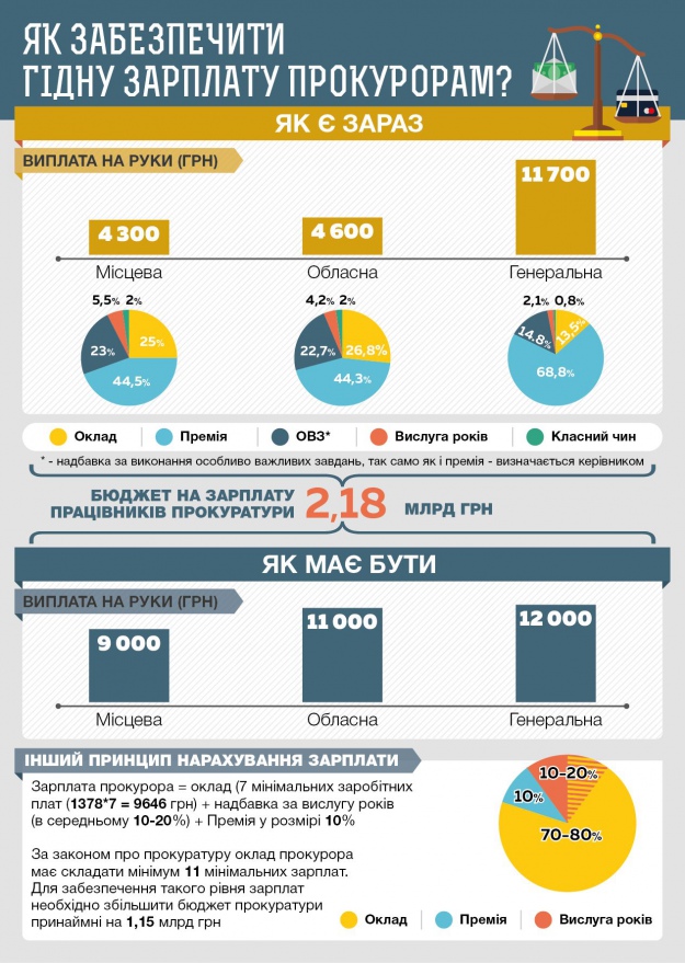 Если привести начисление зарплат в соответствие с требованием закона, уже в этом году доход прокуроров местных прокуратур может вырасти более чем вдвое. При этом зарплата рядовых прокуроров в ГПУ не уменьшится, а перераспределение позволит уменьшить разрыв между зарплатами начальников и подчиненных.