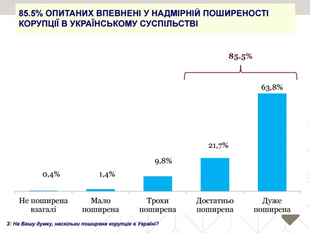 Українці впевнені, що у деяких випадках корупція збільшилась. Понад 2/3 (64%) українців вважають, що корупція є поширеним явищем, а більшість громадян стикаються з випадками корупції щонайменше раз на рік або частіше.