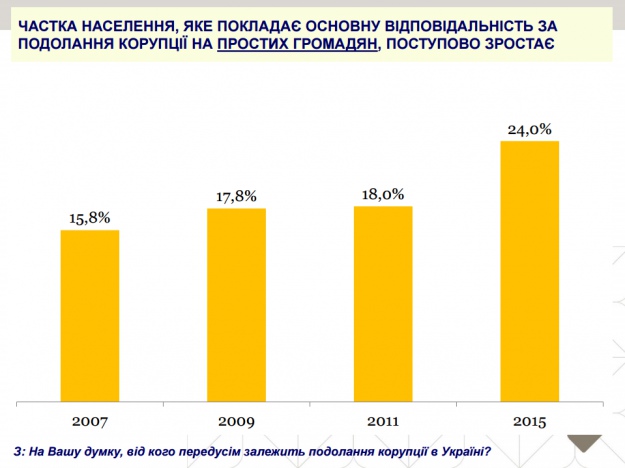 Невпинно зростає кількість людей, що покладають основну відповідальність за боротьбу з корупцією на пересічних громадян – від 15,8% у 2007 році до 18% у 2011 році та до 24% у 2015 році.