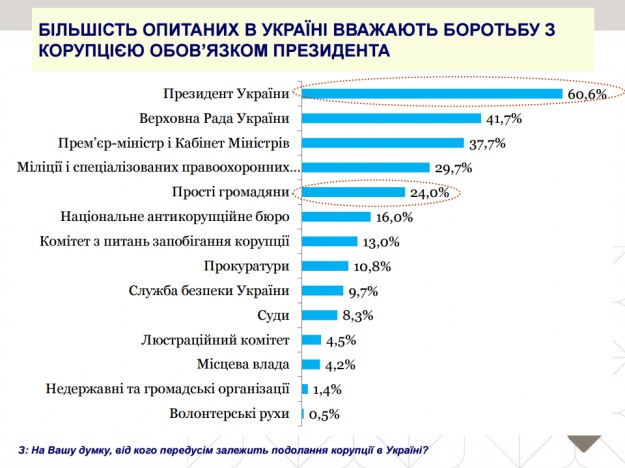 Українці прагнуть, аби високопосадовці та політичні лідери – президент, Верховна Рада, прем’єр-міністр та уряд – очолили реалізацію антикорупційних реформ. На жаль, українцям залишається тільки гадати, хто в уряді сприяє корупції, що є далеким від уявлення, що політичні лідери прагнуть зупинити корупцію.