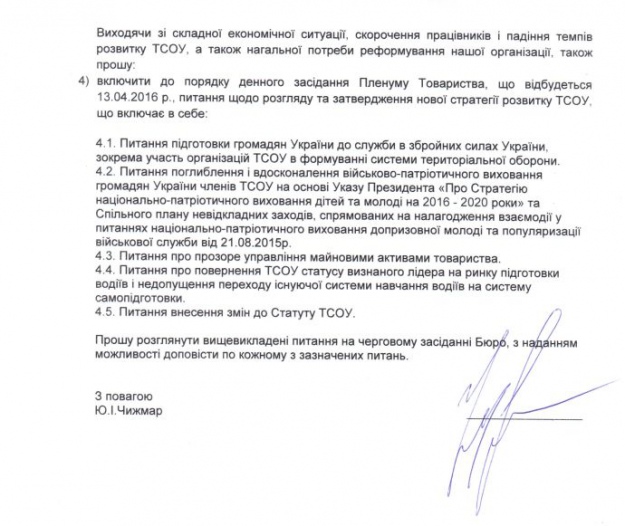 Насамперед, про необхідність відкритого і прозорого управління майновими активами, які дісталися в спадок від ДТСААФ УРСР та активізацію виконання товариством статутних завдань з виховання патріотизму та сприяння обороні держави.