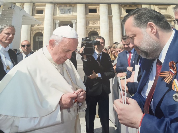 Російські засоби масової інформації поширили новину про те, що в середу, під час Загальної Аудієнції у Ватикані, депутат Думи від КПРФ Павєл Дорохін поздоровив Папу Римського Франциска "с дньом Побєди" і подарував йому георгіївську стрічку. Депутат у коментарі також зазначив, що "Папа сам її надів на рясу".