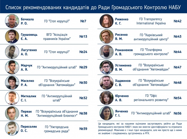 Зокрема, серед кандидатів до нового складу РГК були виявлені особи, наближені до команди Миколи Мартиненка, адвокати, що захищають фігурантів Онищенка по "газовій справі", екс-співробітники СБУ, МВС, екс-податківці тощо. Тобто зараз існує реальна загроза реваншу зі сторони корупціонерів, які руками своїх маріонеток намагатимуться будь-яким чином дискредитувати НАБУ та перешкоджати його діяльності.