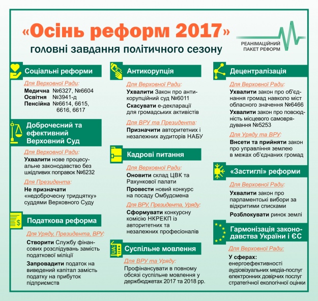 Новий політичний сезон стартував під брендом "Осінь реформ". В пріоритетах Ради на цю осінь спікер Андрій Парубій назвав зміни в сфері освіти, медицини, пенсійного забезпечення і судочинства, а також парламентську реформу.