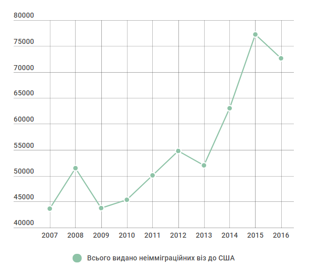 Усього за 2016 рік неімміграційну візу отримали 72624 українця. А взагалі було подано у півтора рази більше заяв – 123095.