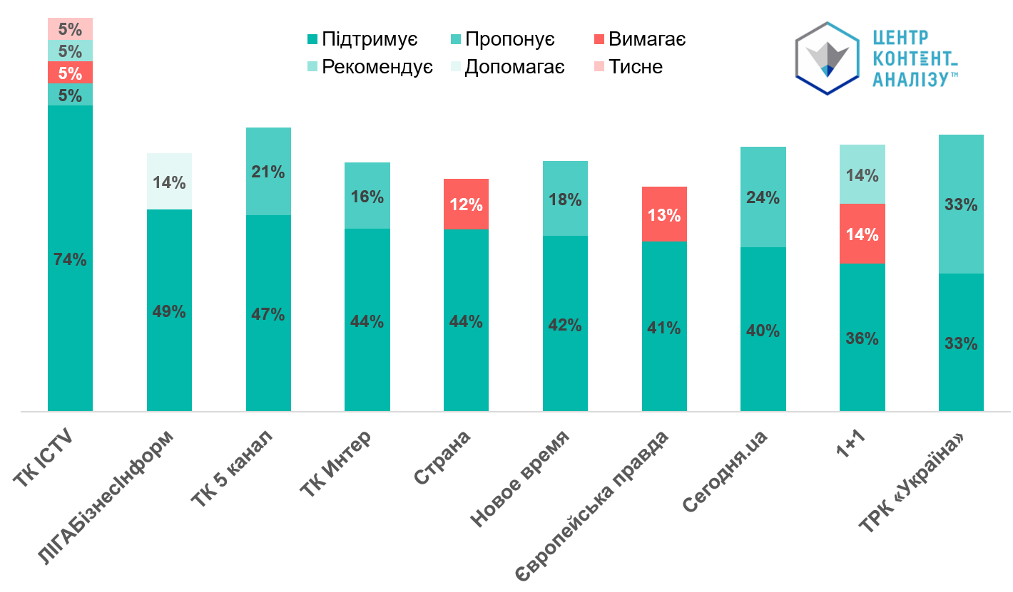 Що ж до інших цікавих спостережень, то інтернет-медіа дещо більше схильні використовувати лексику, якою виражається тиск, а не сприяння, підтримка чи заохочення. Вочевидь, це можна пояснити як стилем інтернет-видань, так і більшим різноманіттям форматів, у тому числі наявністю авторських блогів.