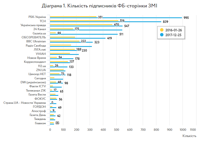 Ми дослідили, як змінювалася кількість фейсбук-підписників у 20 великих україньских ЗМІ.