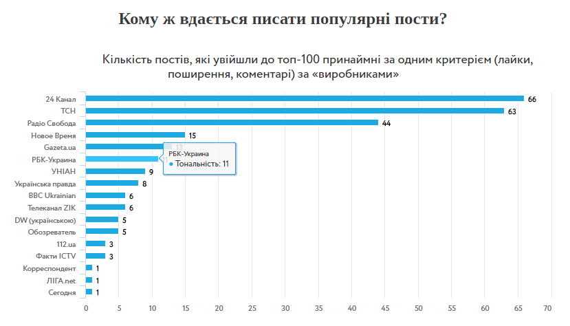 А кому ж вдається генерувати найбільше популярних постів? До топ-3 за кількістю найпопулярніших постів увійшли 24 канал, ТСН та Радіо Свобода. Якщо не брати до уваги відео, то лідери – РБК-Україна, Українська правда та Газета по-українськи.