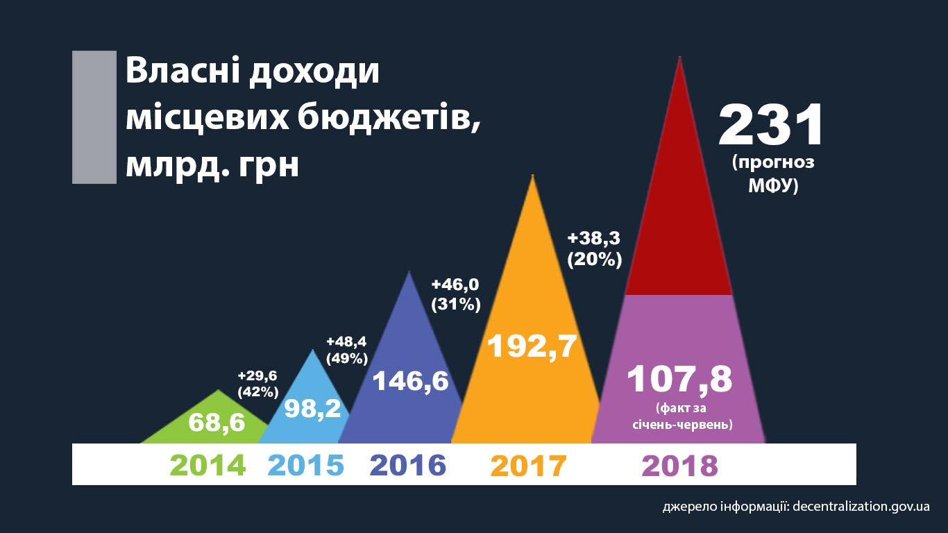 За чотири роки дохідна частина місцевих бюджетів зросла з 68,6 мільярдів гривень у 2014-му до 231 мільярда гривень у 2018 році. Тобто зростання відбулося в 3,3 рази. Це, начебто, дуже добре.