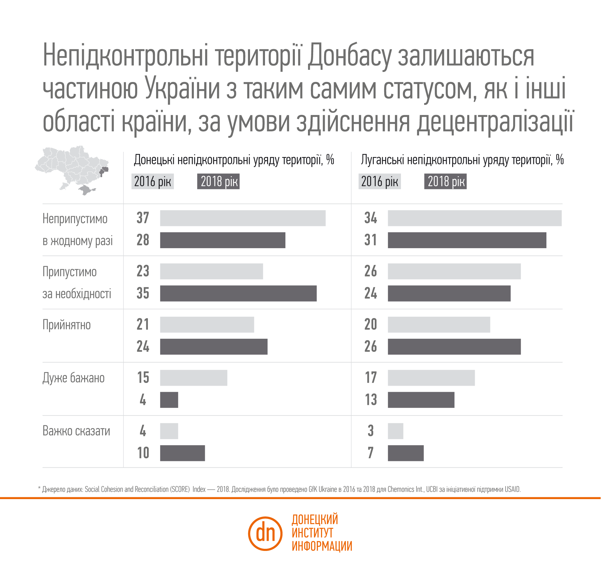 На території непідконтрольних районів Луганської області у 2016 році 63% респондентів у цілому підтримали цю ідею – і стільки ж у 2018 році.