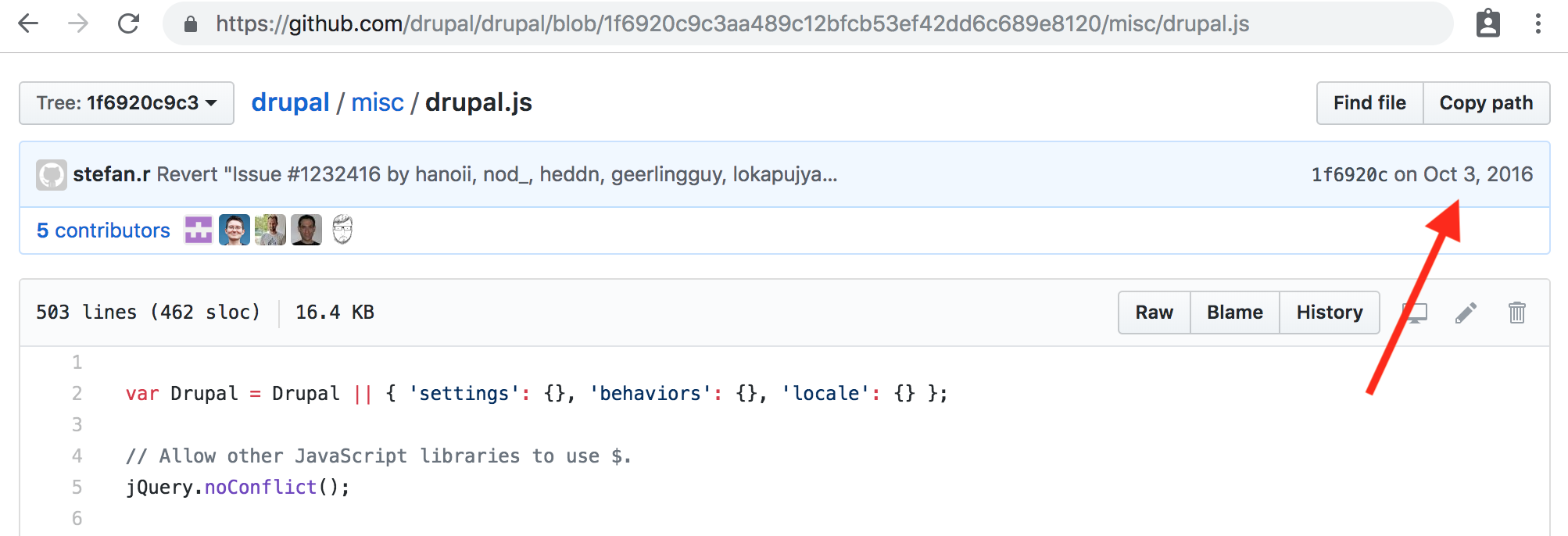 При цьому легко переконатися, що код веб-сайту nazk.gov.ua не оновлювався з жовтня 2016 року. Це можна зробити простим порівнянням версії файлу drupal.js з публічним репозиторієм проекту Drupal.