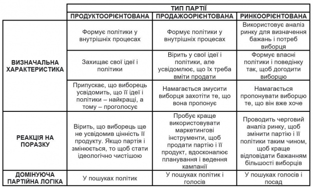 [BANNER1]Цей сплав маркетингу і політичної науки визначає, що партії, які орієнтовані на "продукт" – це структури, які мають "унікальну пропозицію", яка і є стрижнем їхнього створення і існування.