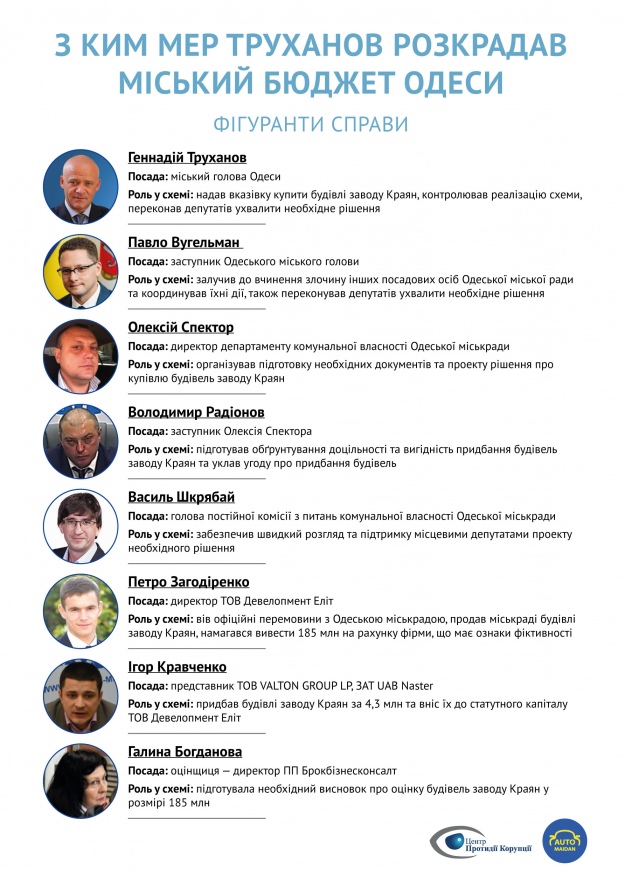 Після отримання оцінки будівель від "свого" експерта та висновку про економічну доцільність придбання будівель "Краяну" заступник Труханова Павло Вугельман, директор департаменту комунальної власності Одеської міськради Олексій Спектор та його заступник Володимир Радіонов проштовхнули через Одеську міськраду необхідне їм рішення про купівлю будівель заводу "Краян".