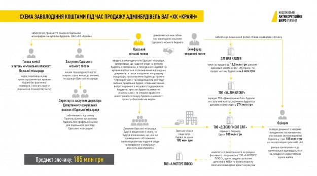 Мера Одеси та ще 7 осіб звинувачують у заволодінні 185 млн грн з міського бюджету. Купивши розвалини заводу "Краян" за копійки, через 10 місяців їх продали Одеській міськраді у 40 разів дорожче.