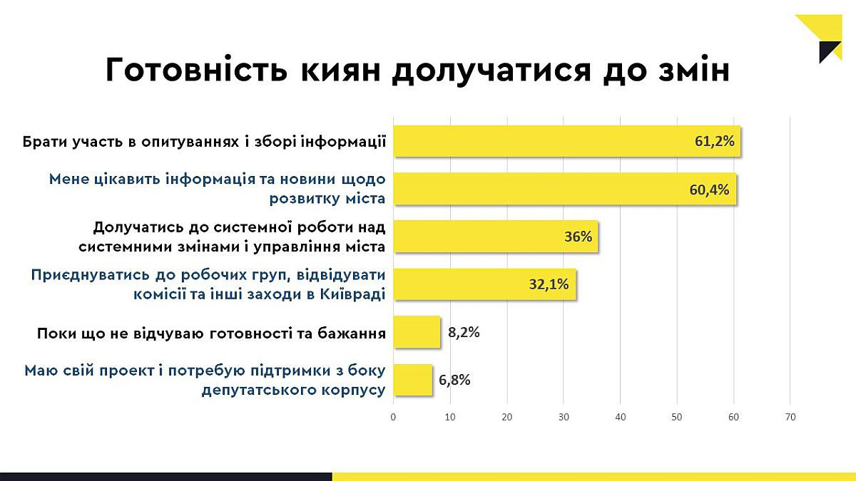 А ще кожен третій респондент підтвердив свою готовність змінювати місто, включаючись в управлінські процеси. Решта учасників написали, що не проти, аби їх інформували про стан справ у столиці.