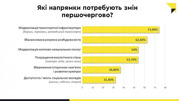 Далі йде збалансована розбудова міста (62,4 % респондентів), модернізація житлово-комунальних послуг (54%) і покращення екологічного стану – 53,7%.