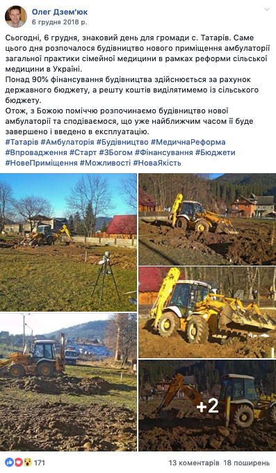 6 грудня Татарівська сільська рада опублікувала фотозвіт про старт будівництва новенької амбулаторії – уже за 2 дні після оголошення переможця тендеру. Місцеві жителі у коментарях дякують голові сільради за таке швидке виконання роботи.
