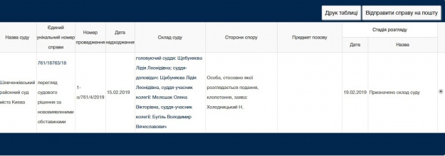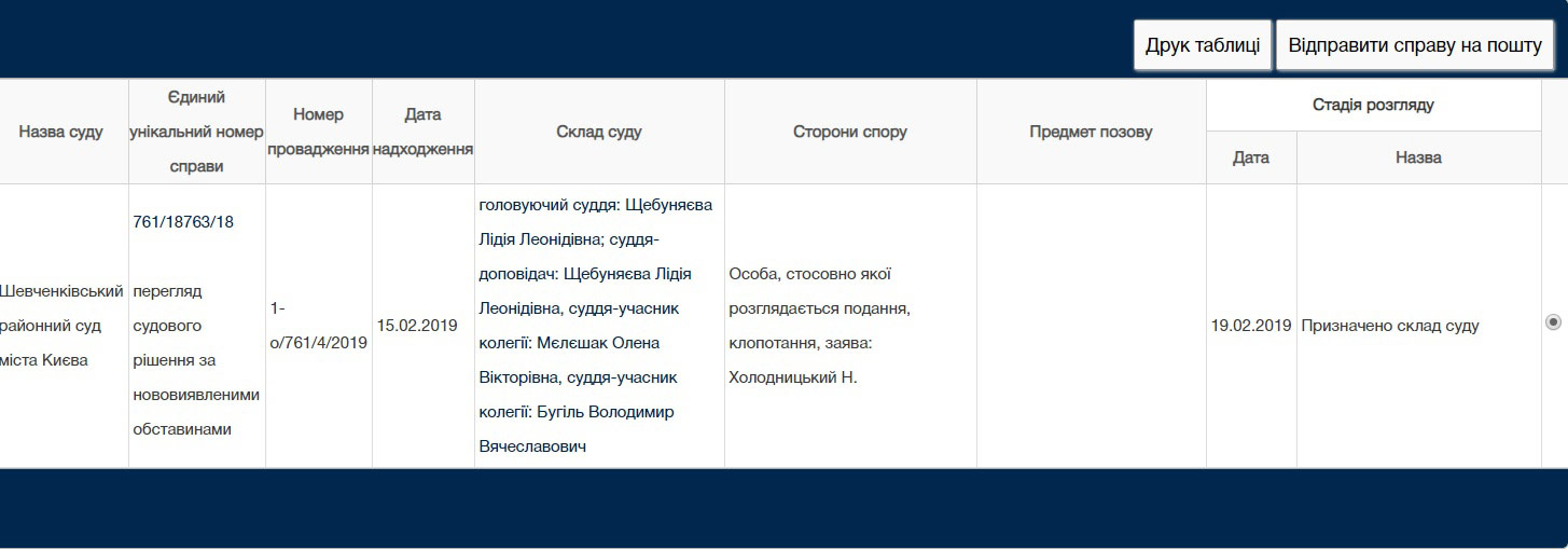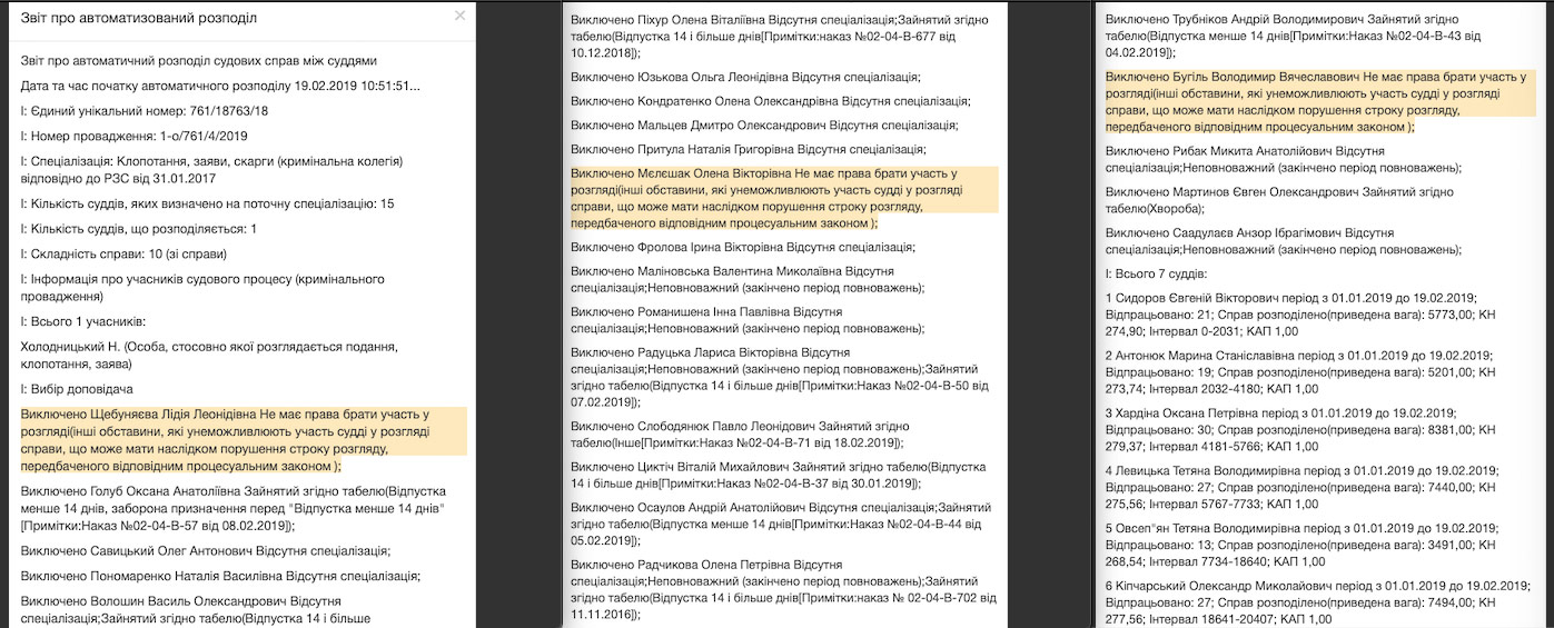 І після всіх вказаних реверсів руху заяви, на порталі судової влади на сьогодні зазначено, що це клопотання розглянуть усе ж таки судді у справі Мартиненка – Щебуняєва, Бугіль та Мєлєшак.