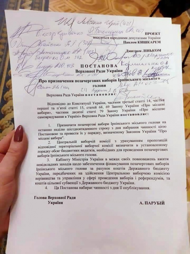 Після ухвалення скандального генплану та подальших подій, пов'язаних із активізацією тотальної забудови міста, народні депутати ініціювали в парламенті проекти постанов про дострокові вибори в Ірпені міського голови та місцевої ради.