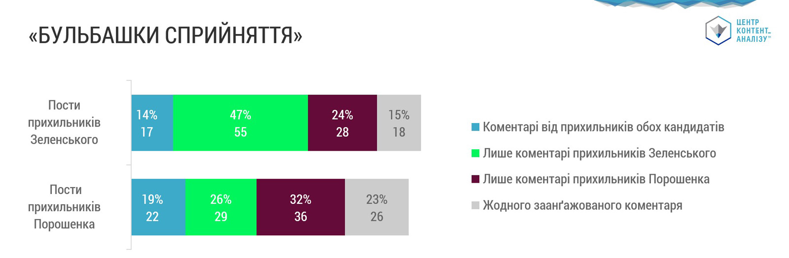 У "зеленої" частини Facebook половина передвиборчих постів, які мали хоч один коментар, лишалася без коментарів опонентів; у "фіолетової" частини таких постів була третина.