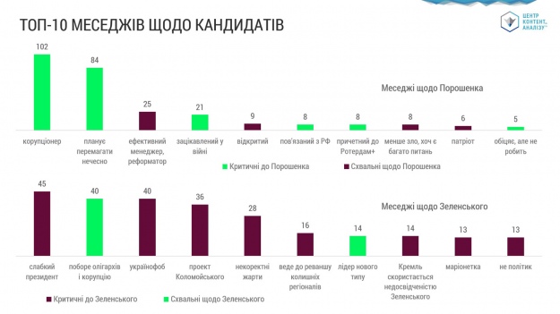 Зокрема, 4 із 6 найпопулярніших негативних меседжів про Порошенка були фейковими або принаймні дуже маніпулятивними. Чого не спостерігалося у критиці Зеленського.